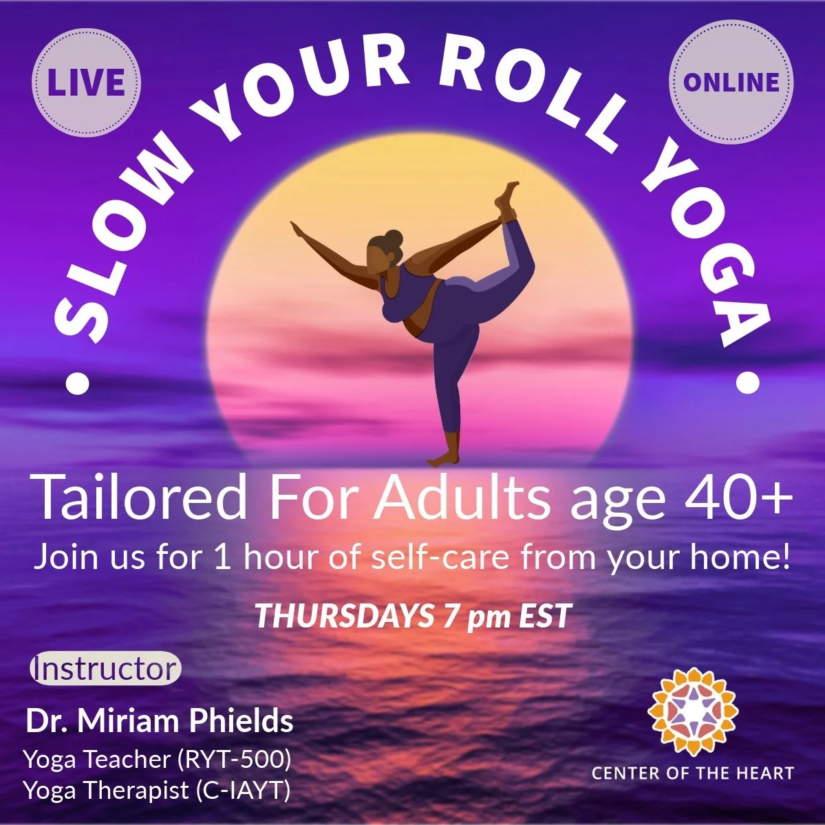 Join us for an hour of self-care with a slow and gentle yoga class tailored for adults over age 40. This live online class is designed for beginners, all bodies (flexible or not), and experienced yogis. The class will include yogic breathing, meditation, and yoga poses for mature bodies. No need to leave your home. Join us live online streaming via Zoom.